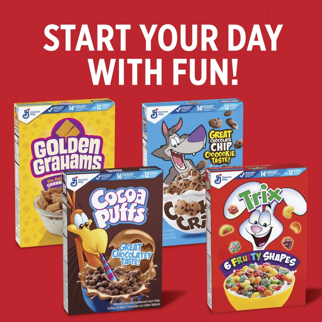 Trix breakfast cereal brings flavorful fun to your family's morning! The naturally and artificially fruit flavored sweetened corn puffs feature six fruity shapes bursting with the fruity taste kids love. Each serving of Trix Cereal provides 14g whole grain (at least 48g recommended daily), and has a good source of calcium, with 12 vitamins and minerals. What a great way for your family to start their day. A quick and easy win for kids, reach for Trix as part of a breakfast, a tasty after school snack, or an anytime treat. Pour a portion into a sandwich bag to take with you on the go or on your next family adventure. Toss some cereal pieces into cereal bars recipes. Use some as a yummy and colorful ice cream topping. However you enjoy the taste, General Mills cereals spread goodness from tots to grown-ups. Contains one cardboard box of crunchy Trix Fruity Breakfast Cereal, Six Fruity Shapes, Whole Grain Corn Puffs, 10.7 oz; Perfect for instant snacking, or a part of breakfast and meals.