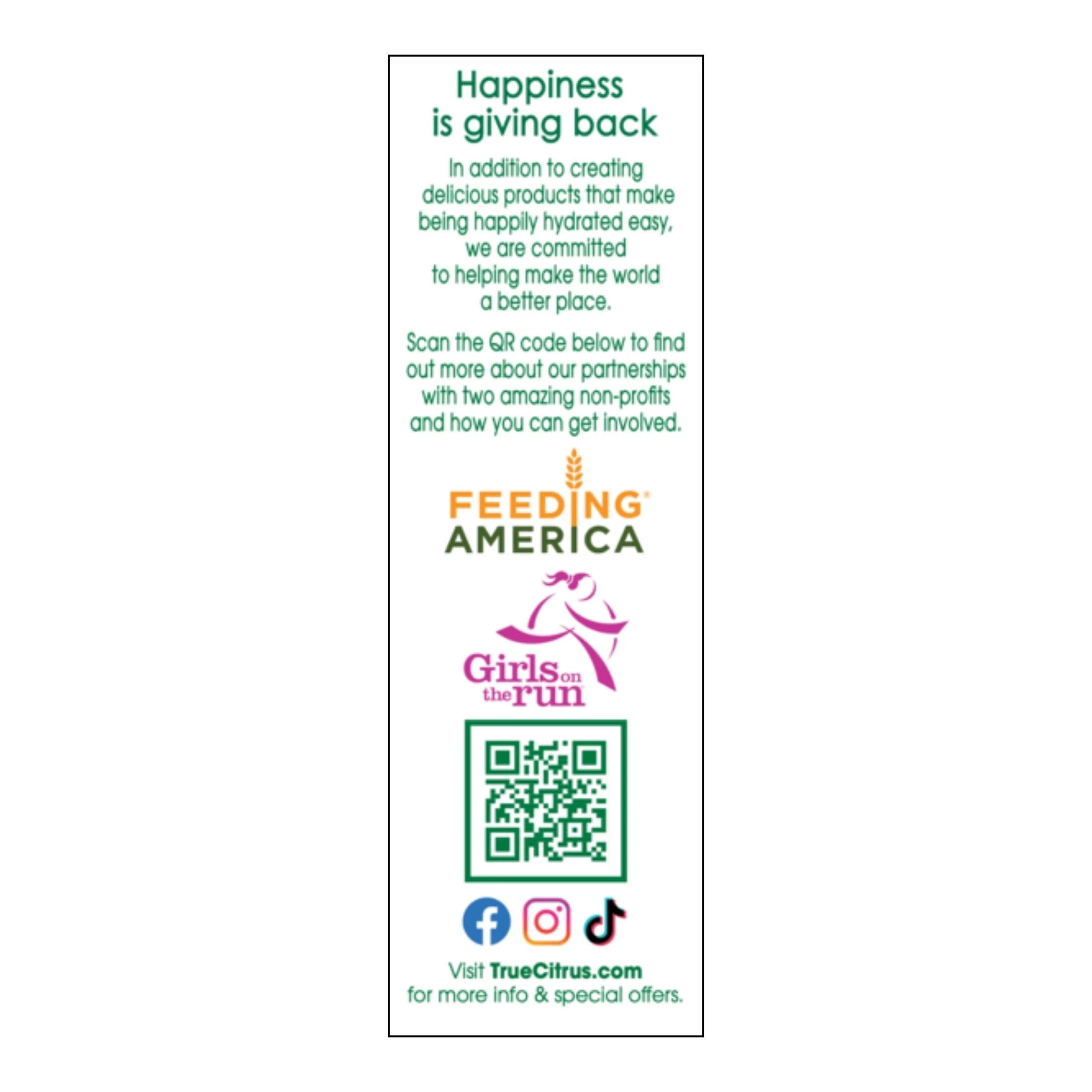 Stay happily hydrated throughout your day! True Lemon Lemon Line Lemonade is a powdered drink mix made with simple, Non-GMO ingredients including real lemon juice and oils. Each drink mix packet offers a delicious way to enhance your water with only 10 calories, 1g sugar per water flavoring packet and also provides 50% DV of Vitamin C per packet. With NO artificial sweeteners, True Lemon Lemon Lime Lemonade is sweetened only with natural stevia and a touch of sugar, and is caffeine free, sodium free and gluten free. It's easy to stay happily hydrated throughout your day with True Lemon Lemon Lime Lemonade drink mix packets. And, bonus, your purchase of this product helps us support two amazing national non-profits, Feeding America® and Girls On the Run®!