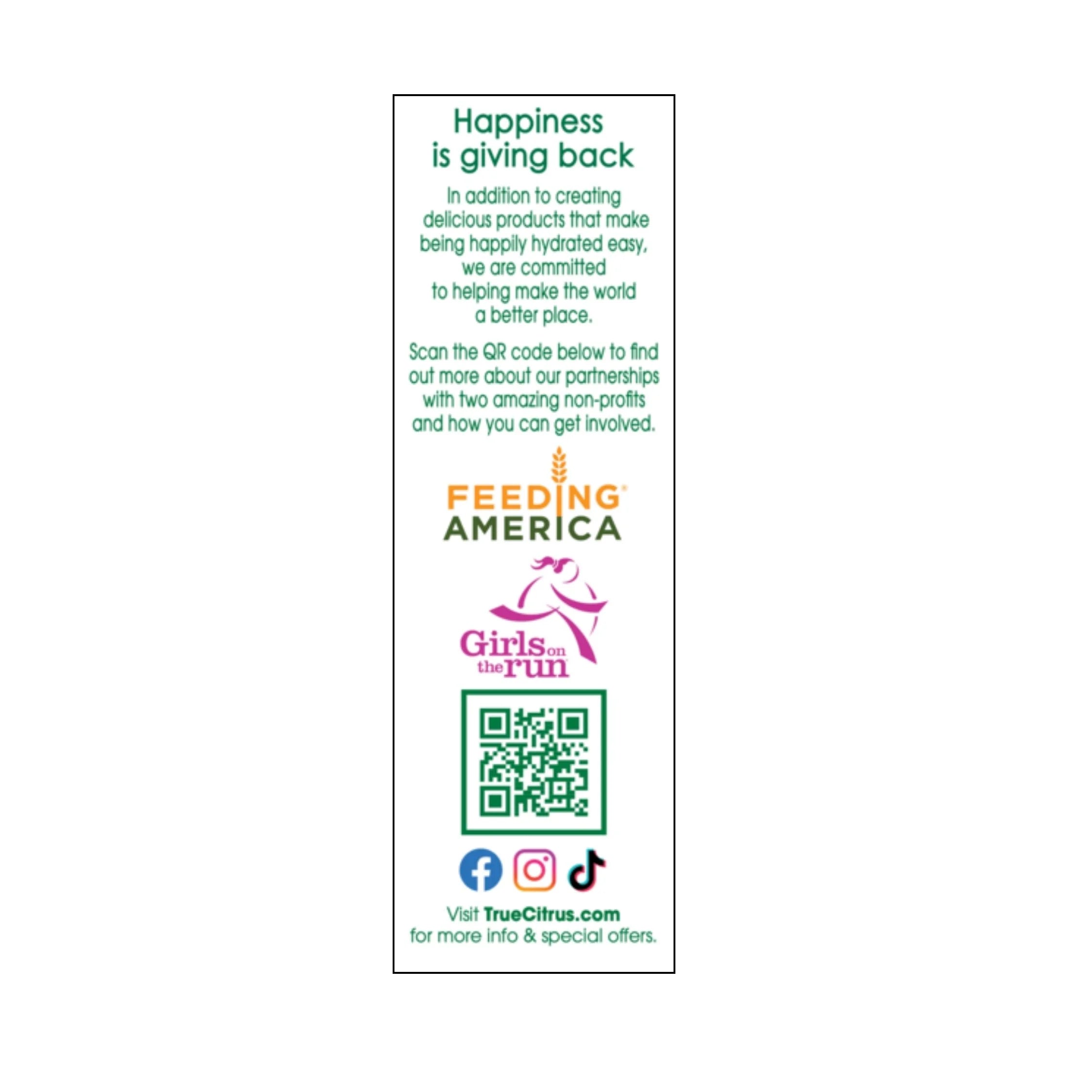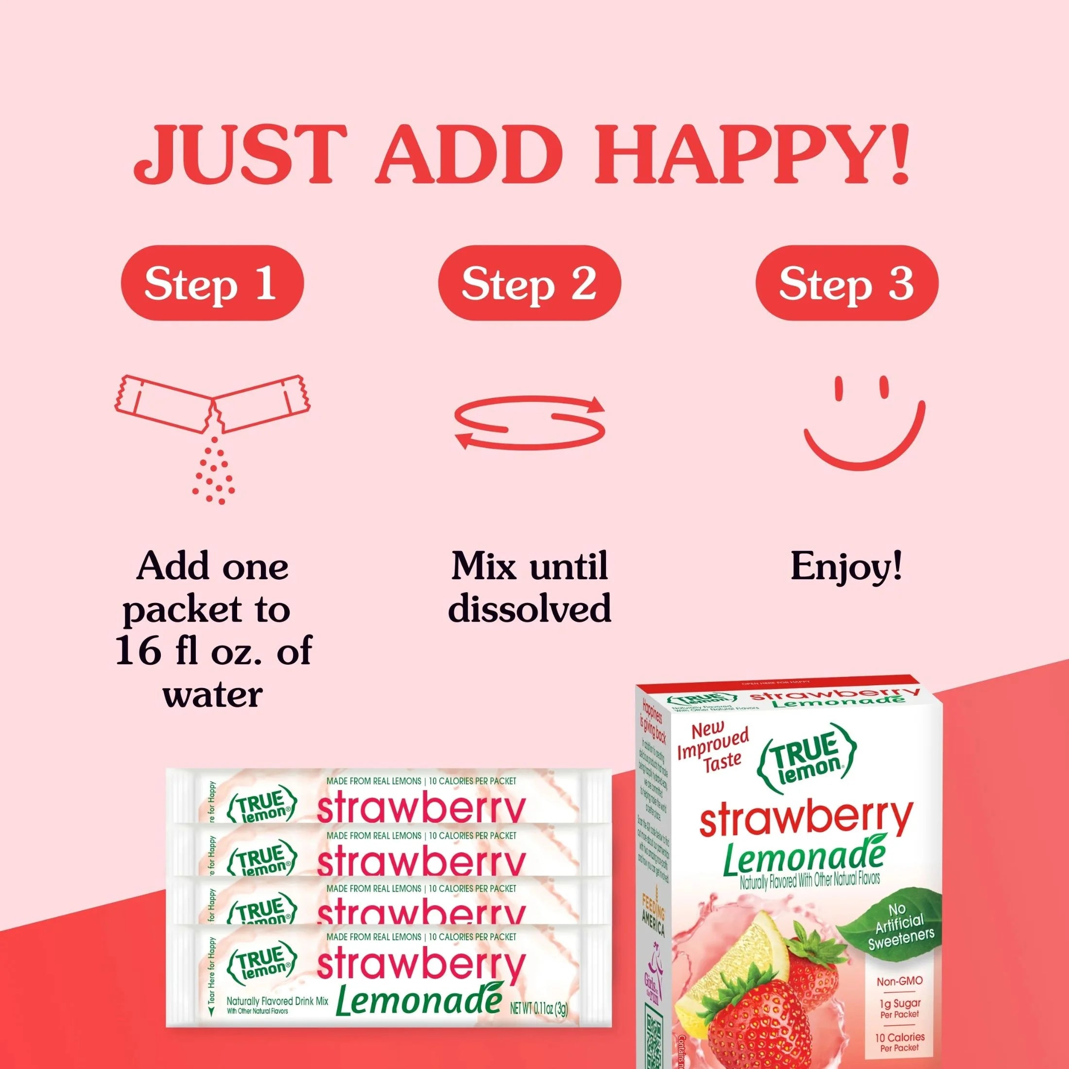 Stay happily hydrated throughout your day! True Lemon Strawberry Lemonade is a powdered drink mix made with simple, Non-GMO ingredients including real lemon juice and oils. Each drink mix packet offers a delicious way to enhance your water with only 10 calories and 1g sugar per water flavoring packet. With NO artificial sweeteners, True Lemon Strawberry Lemonade is sweetened only with natural stevia and a touch of sugar, and is caffeine free, sodium free and gluten free. It's easy to stay happily hydrated throughout your day with True Lemon Strawberry Lemonade drink mix packets. And, bonus, your purchase of this product helps us support two amazing national non-profits, Feeding America® and Girls On the Run®!