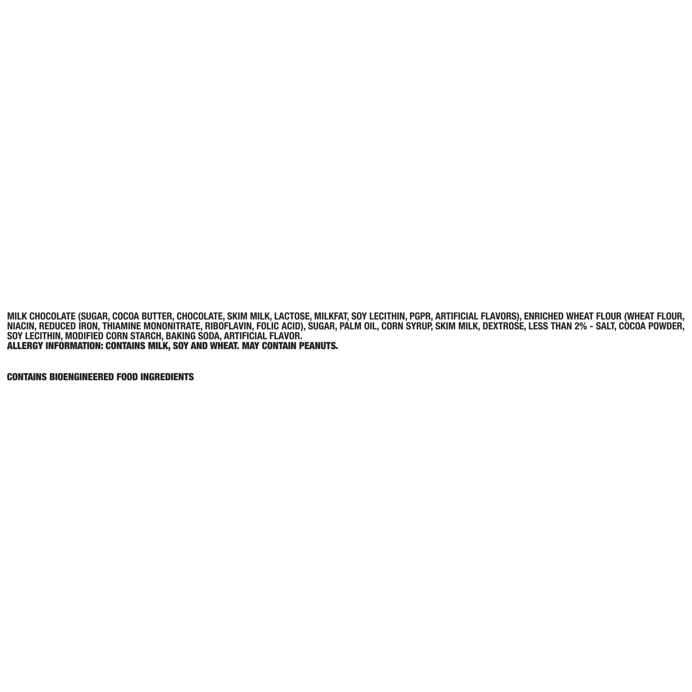 INGREDIENTS: MILK CHOCOLATE (SUGAR, COCOA BUTTER, CHOCOLATE, SKIM MILK, LACTOSE, MILKFAT, SOY LECITHIN, PGPR, ARTIFICIAL FLAVORS), ENRICHED WHEAT FLOUR (WHEAT FLOUR, NIACIN, REDUCED IRON, THIAMINE MONONITRATE, RIBOFLAVIN, FOLIC ACID), SUGAR, PALM OIL, CORN SYRUP, SKIM MILK, DEXTROSE, LESS THAN 2% - SALT, COCOA POWDER, SOY LECITHIN, MODIFIED CORN STARCH, BAKING SODA, ARTIFICIAL FLAVOR./div>