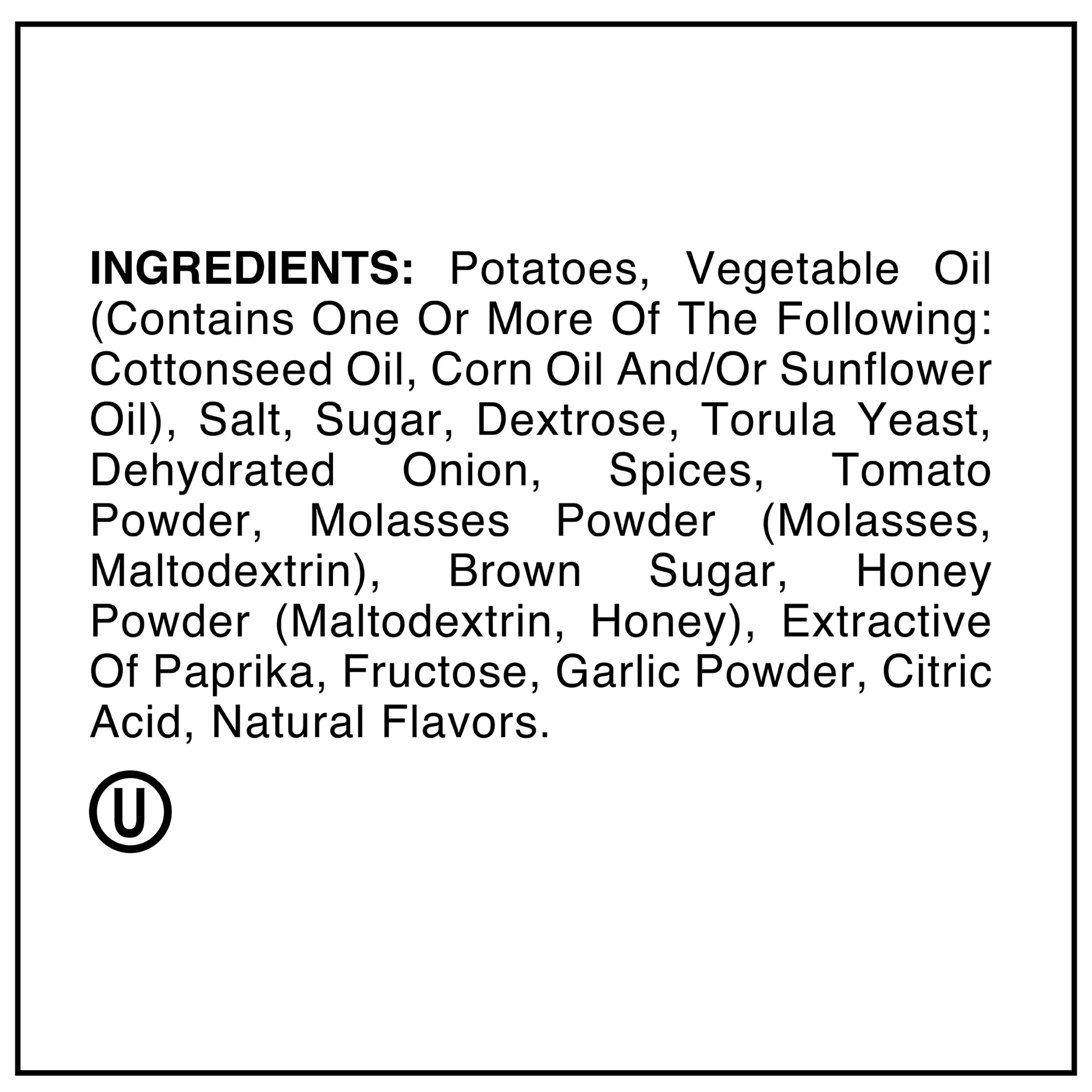 Potatoes, Vegetable Oil (contains one or more of the following: corn oil, cottonseed oil, and/or sunflower oil), salt, sugar, dextrose, torula yeast, dehydrated onion, spices, tomato powder, molasses powder (molasses, maltodextrin, honey), extractive of paprika, fructose, garlic powder, citric acid, natural flavors/div>
