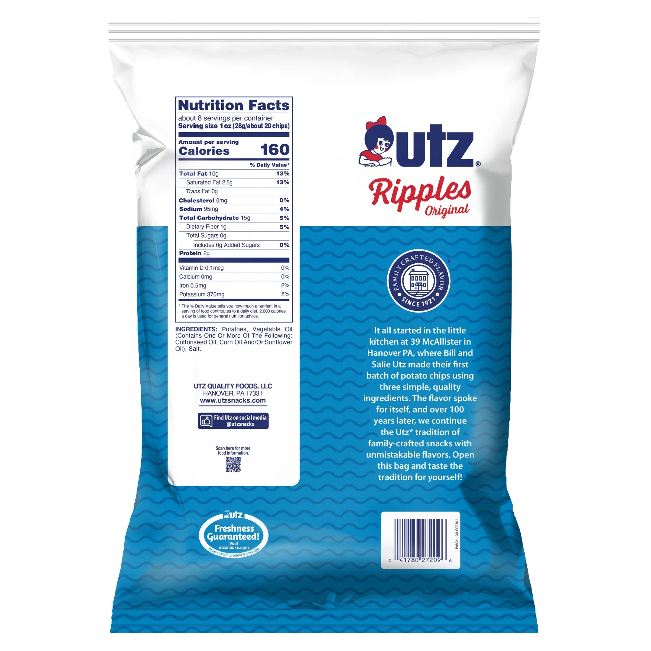 Introducing the Utz Ripples Original Potato Chips, a timeless classic that is sure to satisfy your snack cravings! In this 7.75 oz bag, you will discover the perfect balance of crispiness and flavor. These chips are expertly crafted from high-quality potatoes and seasoned with just the right amount of salt. Each chip boasts a unique rippled texture, designed to maximize your enjoyment when dipped in your favorite chip pairing. Whether you are lounging at home, having a picnic, or hosting a gathering, these chips are the ideal companion. Share them with friends and family or keep them all to yourself – we won’t judge! Elevate your snacking game with Utz Ripples Original Potato Chips, where every bite is a ripple of pure delight.