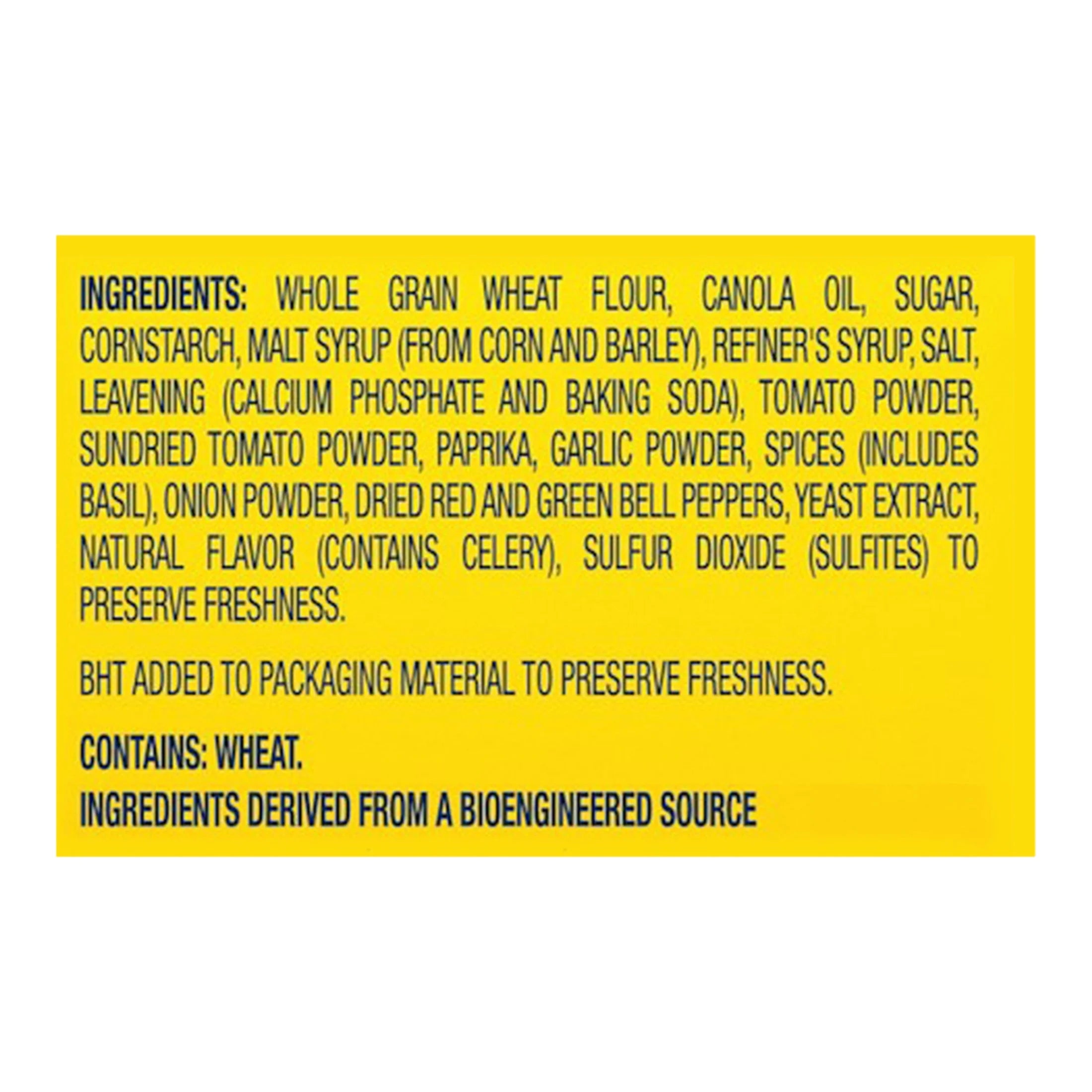 Whole Grain Wheat Flour, Canola Oil, Sugar, Cornstarch, Malt Syrup (From Corn And Barley), Refiner'S Syrup, Salt, Leavening (Calcium Phosphate, Baking Soda), Tomato Powder, Sundried Tomato Powder, Paprika, Garlic Powder, Spices (Includes Basil), Onion Powder, Dried Red And Green Bell Peppers, Yeast Extract, Natural Flavor (Contains Celery), Sulfur Dioxide (Sulfites) To Preserve Freshness. Bht Added To Packaging Material To Preserve Freshness. Contains: Wheat./div>